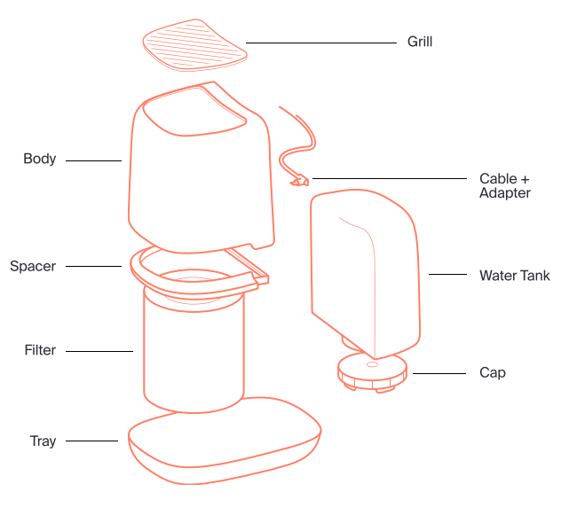 Here's a full view of the Bedside Humidifier 2.0's parts for your reference: